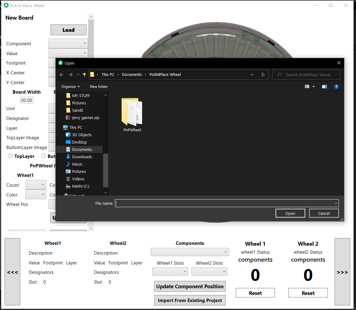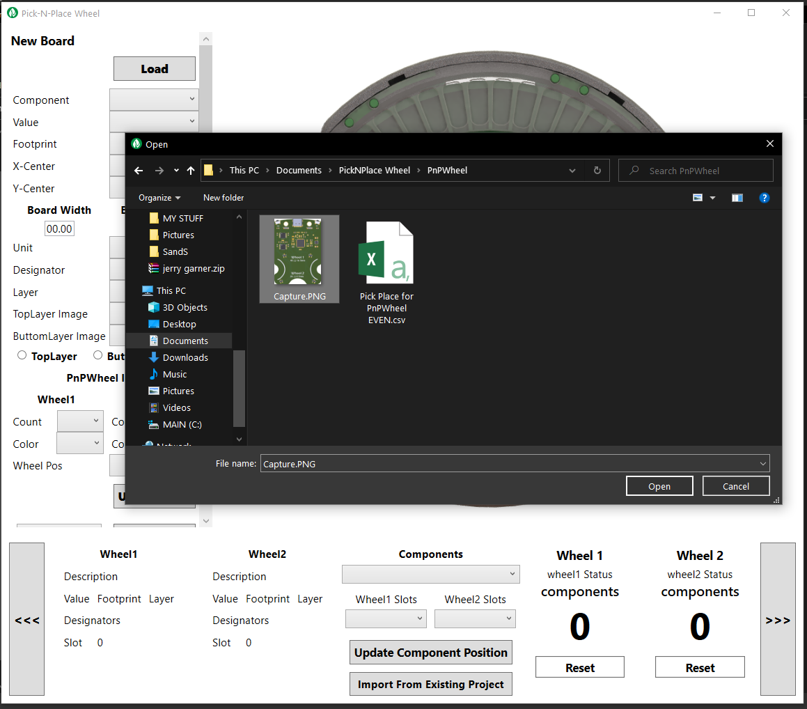 The folder containing the CSV and image should then be copied into the “PickNPlace Wheel” folder which can be found inside the Documents folder, this folder is automatically created when you download and install the App from the GitHub repository, the folder should hold all of your pick and place PCB projects, if you don’t see this folder in your documents folder, launch the App and then close it, the folder should show up.