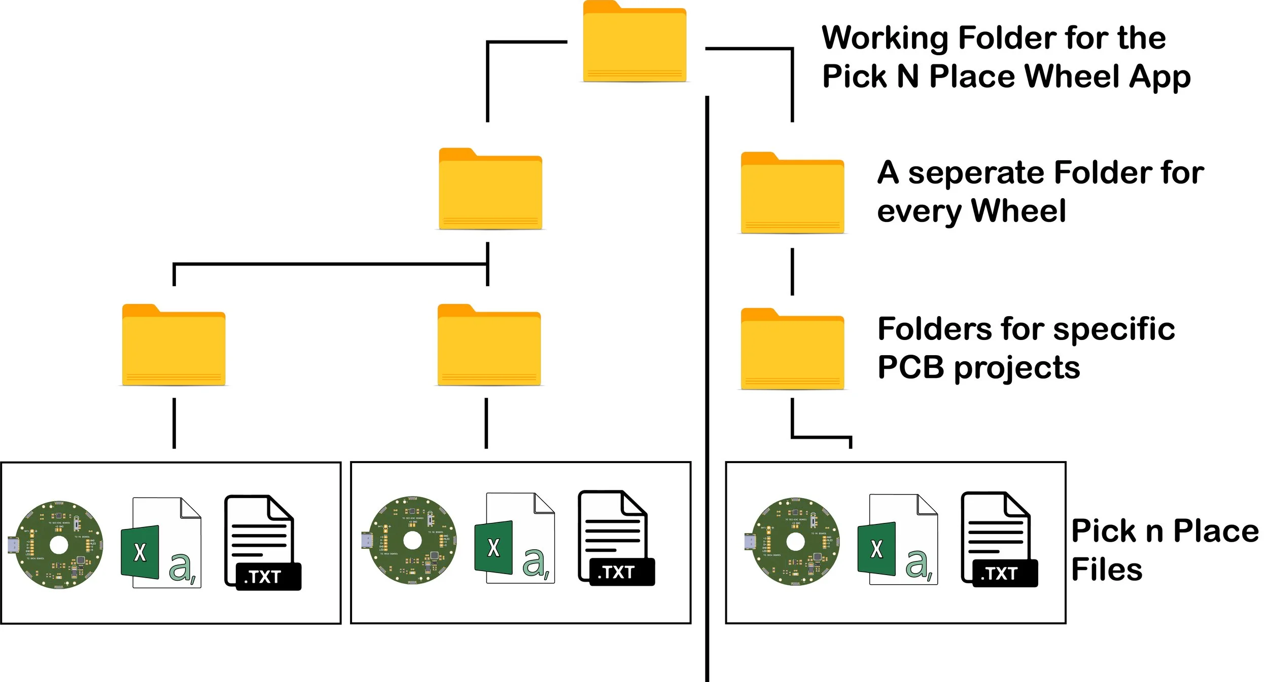 The image above shows the recommended way to organize the generated files, at the top level you have the main working folder for the App, this is where the App will first direct you to when you click on the Load button, on the second level you have a folder for every Pick ‘N’ Place Wheel that you build, its important to create a separate folder for every wheel since you’ll likely be loading the wheels with different sets of components. On the third level, you have the main PCB project folders, this is where you’ll put the generated CSV file and the board image, this folder should also hold the config.txt file for the specific PCB project, a new folder must be created for every board that you intend to populate using the Pick ‘N’ Place Wheel.
