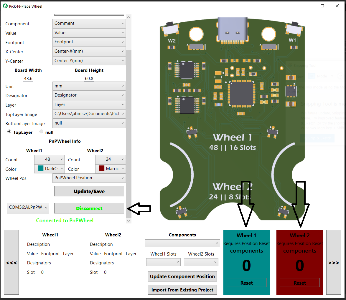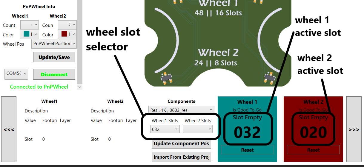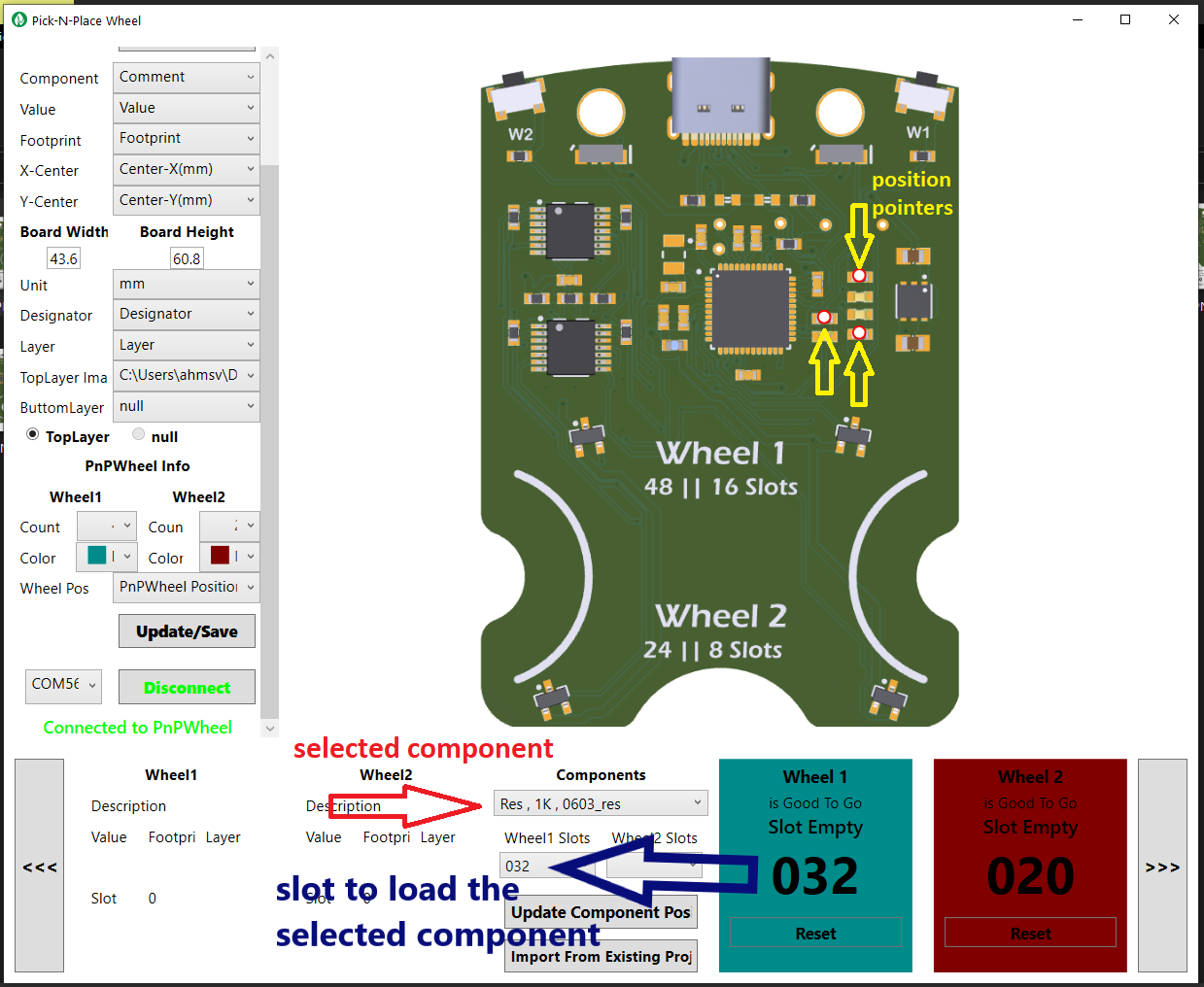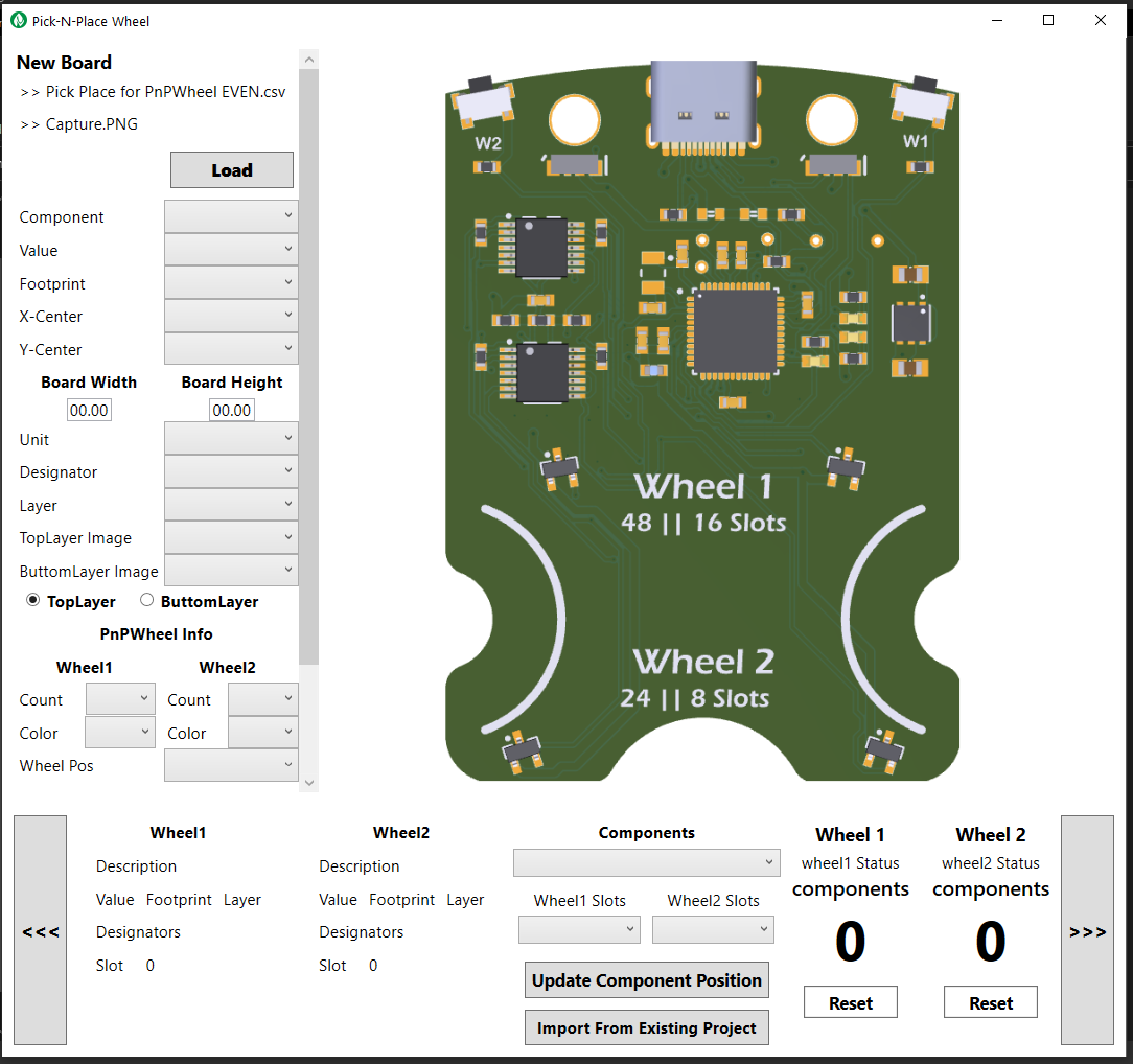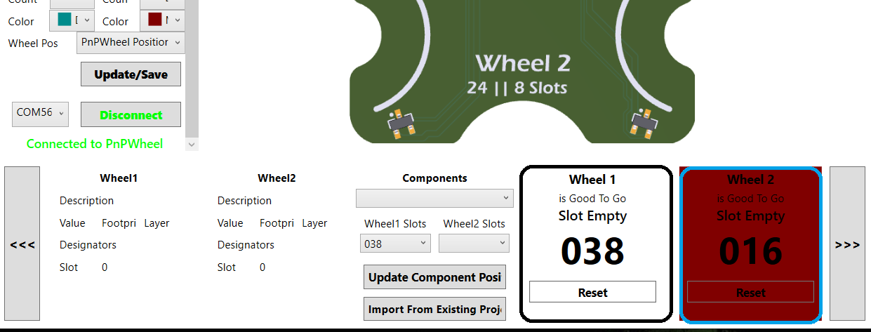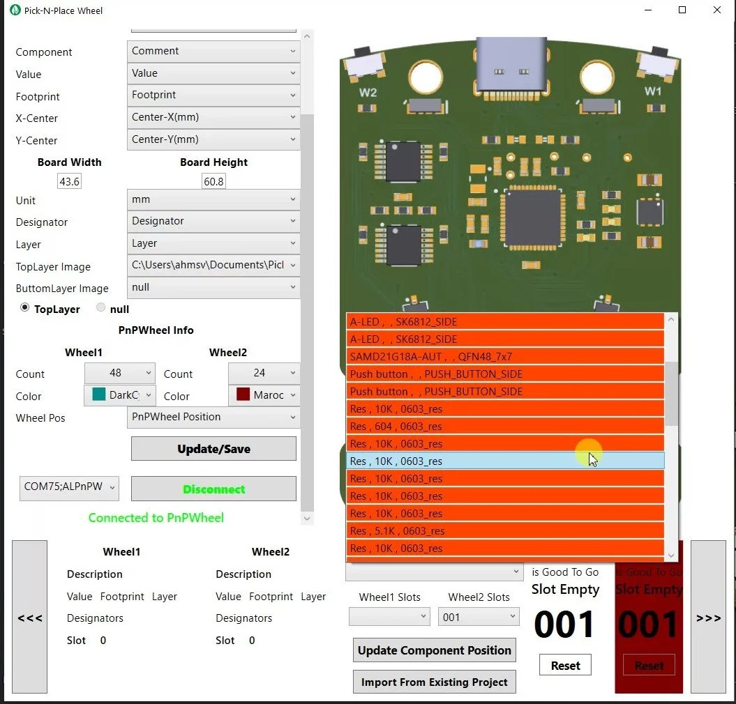 After the initial setup process described above, the final step before you can start populating your PCB is Loading components into the wheel and updating the pick and place csv with the corresponding slot indexes, this is a very straightforward process, and it only needs to be done Once.