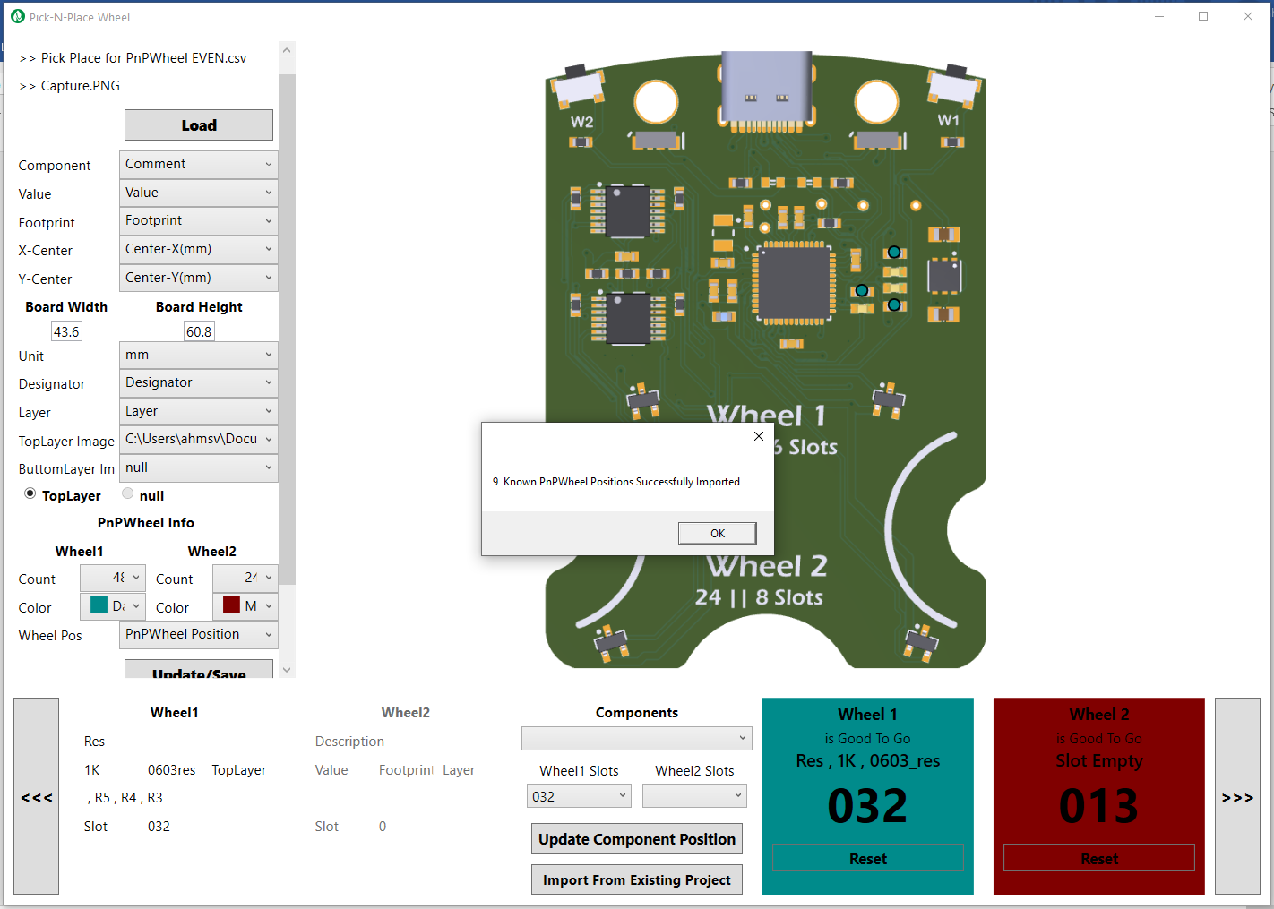 2. Import Loading Process – if you have already done the physical loading process once and you have already set up the Pick ‘N’ Place wheel for a different PCB and you’ll like to use the same wheel to populate a new PCB, probably because the boards use the same sets of components. In that case, you can simply import the “components position information” from the CSV for the previous PCB. What this essentially means is that if your PCB projects often use the same sets of components, you can use one Pick ‘N’ Place Wheel to assemble them all.