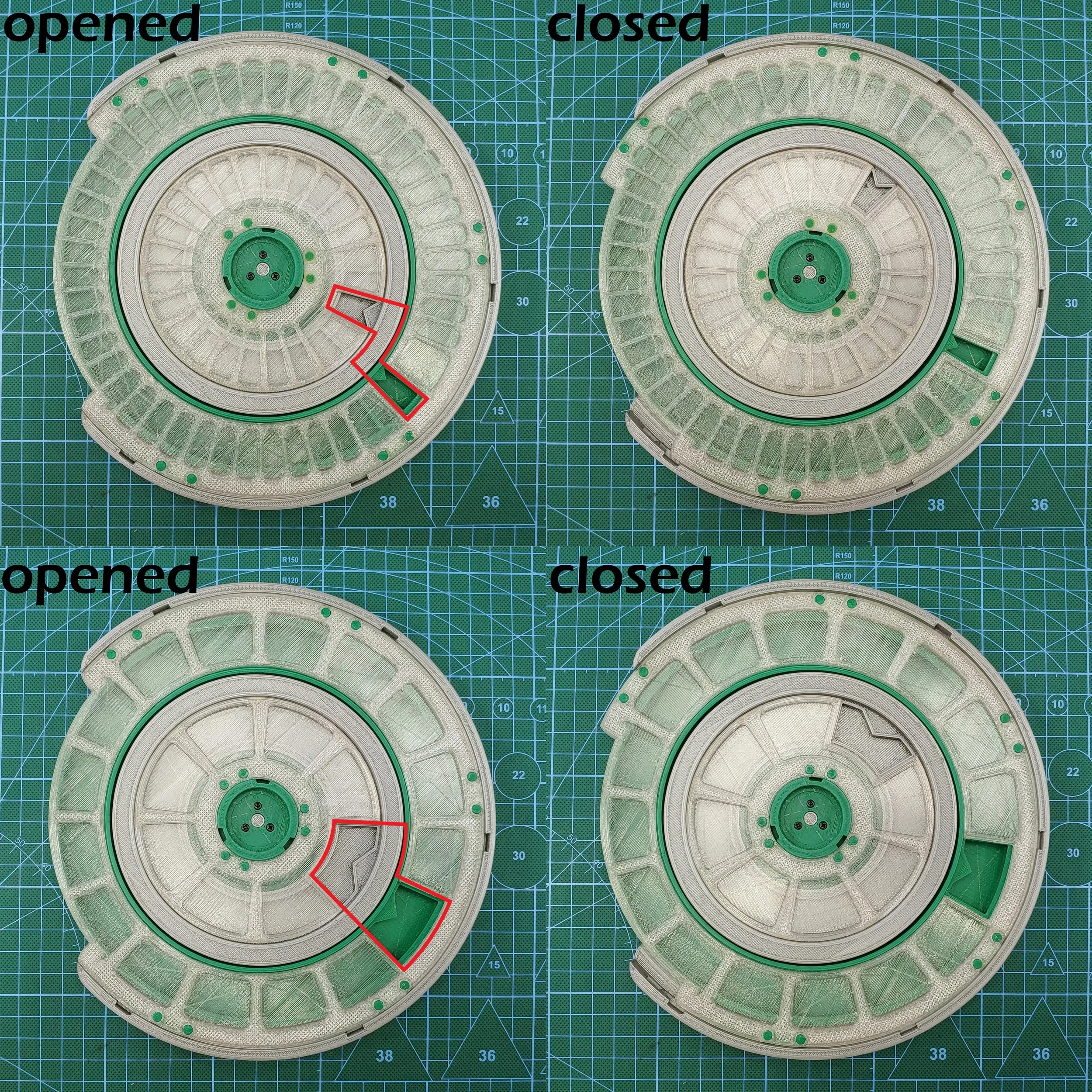 Before resetting the wheel, make sure the top covers and their slot openings are in the opened state, resetting the wheel in the closed state will produce erroneous indexing. The images below shows the wheels in their respective opened and closed states.