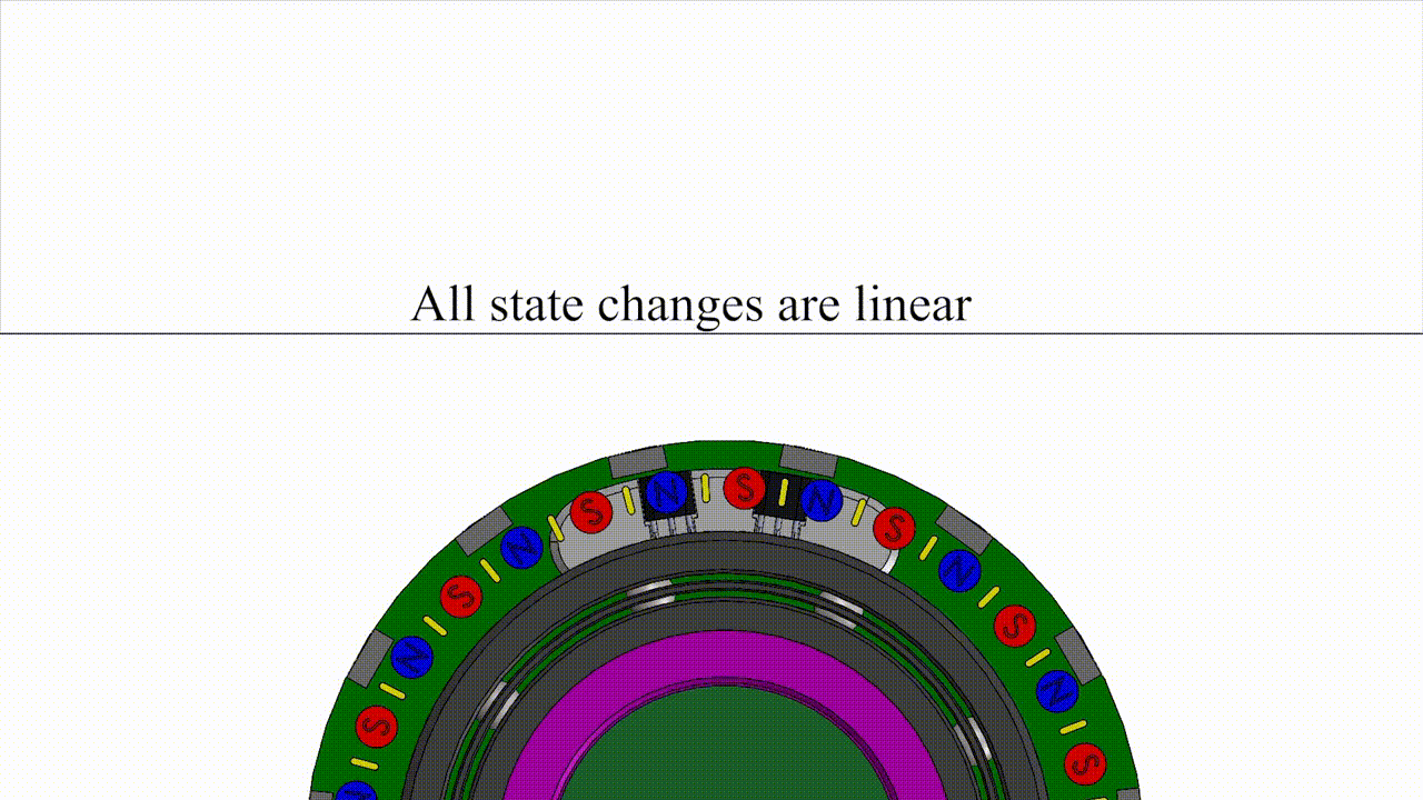 Taking a closer look at the alternating magnet arrangement that makes up the encoder, we can clearly see that there is a linear region between each pair of magnets, so there is a gradual transition from one encoding state to another (between steps).