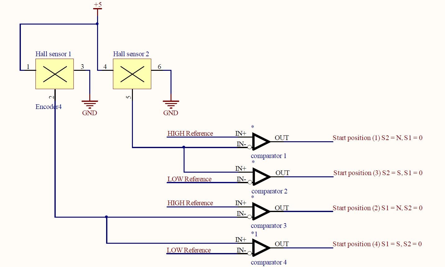 For a greater than (>) comparator, the reference voltage is connected to the inverting input and the input signal to be compared is connected to the non-inverting input of the comparator, for a less than (<) comparator, the inputs are interchanged, so reference to +ve and signal to -ve. With this connection, we can wire a pair of comparators to each of the hall effect sensors on the encoder to generate a digital signal that represents either the north pole or the south pole of the magnets, and consequently generate four digital signals that represent the four possible states of the magnetic rotary encoder.