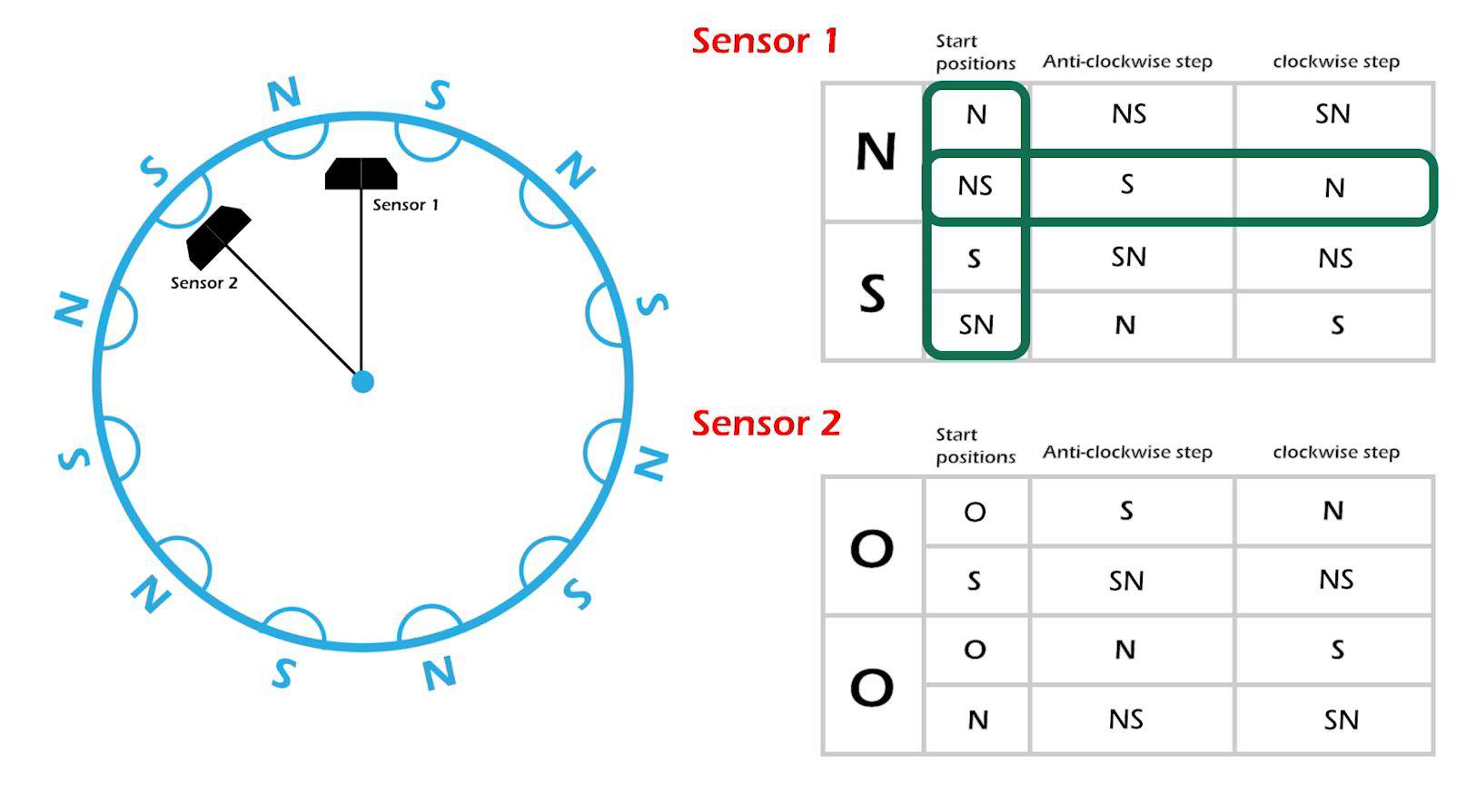 The tables show the state of each sensor with respect to the other at any point in time.. so when sensor 1 is facing north, sensor 2 will be in the neutral position, which is represented as a zero on the tables. from that information, we can further deduce the state that represents one clockwise step and one anticlockwise step, based on the four possible start positions.