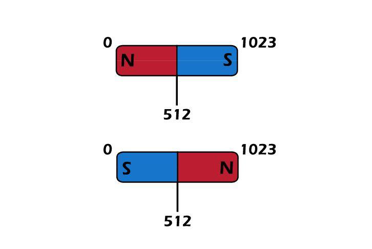 Another thing worth mentioning is the operation of the linear hall effect sensors used in this rotary encoding system; the range of analog values from the sensor is divided into two, so the lower half could be assigned to the North pole and the upper half to the South, or vice versa, the image below shows the magnet pole assignment for a 10 bit ADC system.