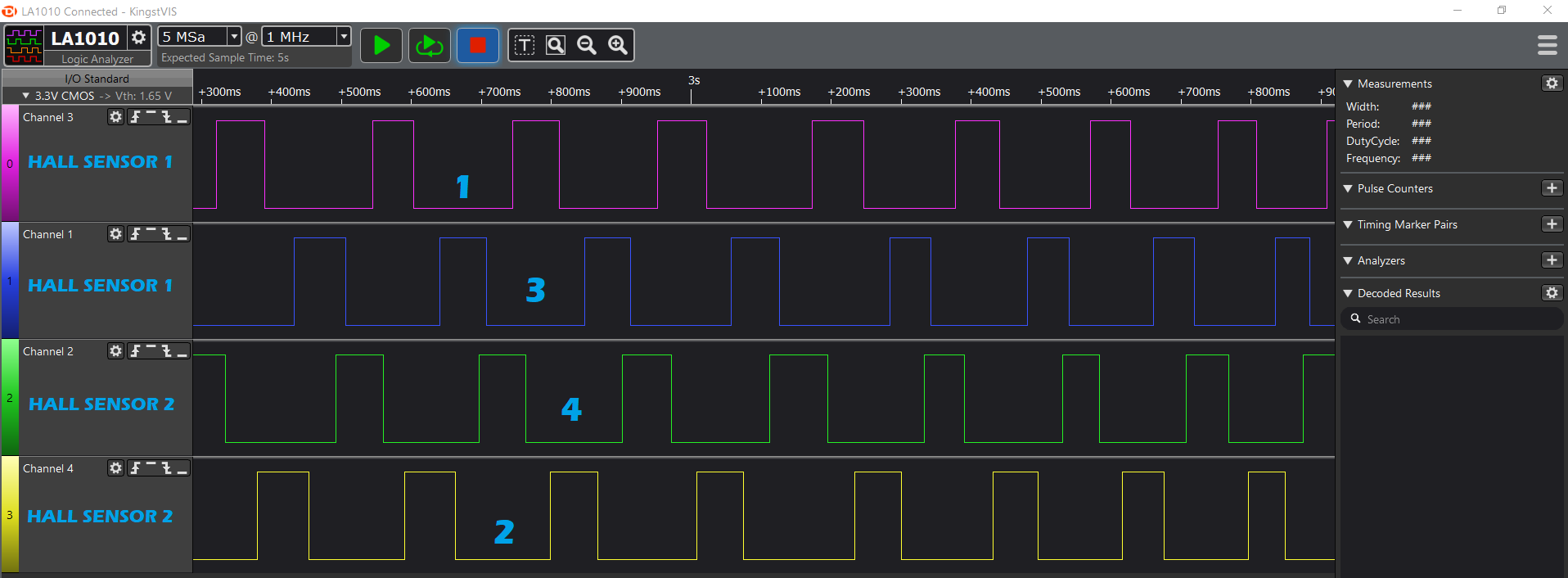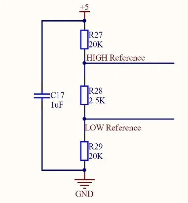 First, we define a voltage window that signifies when any of the Hall effect sensors is halfway between two opposing magnets so that any voltage reading that falls outside this window is considered to be either the North pole or the South pole of the magnet. This is done with a simple voltage divider network.